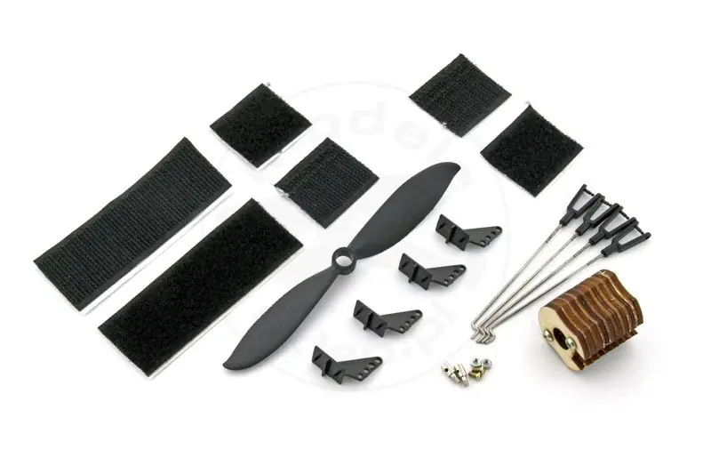 Zestaw drobnych akcesoriów do modelu Pioneer firmy R-Planes. Zestaw zawiera: 1 x śmigło 4 x orczyk wklejany 4 x popychacz z zamontowanym snapem 1 x łoże silnika 2 x kompletne mocowanie bowdena 1 x komplet rzepów (1 x duży, 2 x małe)