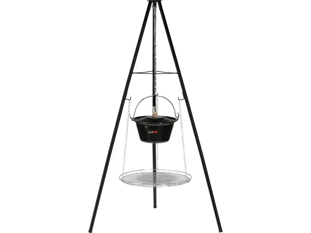 Przenośny grill węglowy na trójnogu z rusztem i kociołkiem zamykanym pokrywą. Dwie opcje podgrzewania pozwalają przygotować różne rodzaje potraw w tym samym czasie lub osobno.
