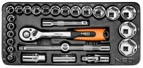 Producent NEO TOOLS Symbol 84-238 Ilość elementów 27 szt. Materiał Stal chromowo-wanadowa Rozmiary nasadek Od 8 do 36 mm Waga 1000 g Kod EAN 5907558424355