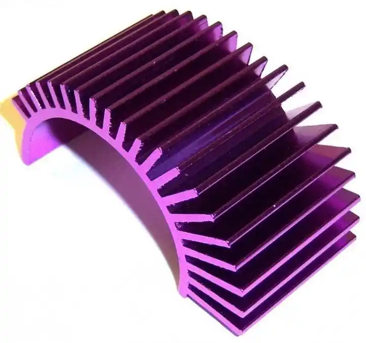Purpurowy, aluminiowy radiator odprowadzający ciepło, dodatkowo wyposażony w wentylator zakończony wtyczką BEC. Odpowiedni do silników klasy 540-550. Wysokiej jakości produkt marki HSP.