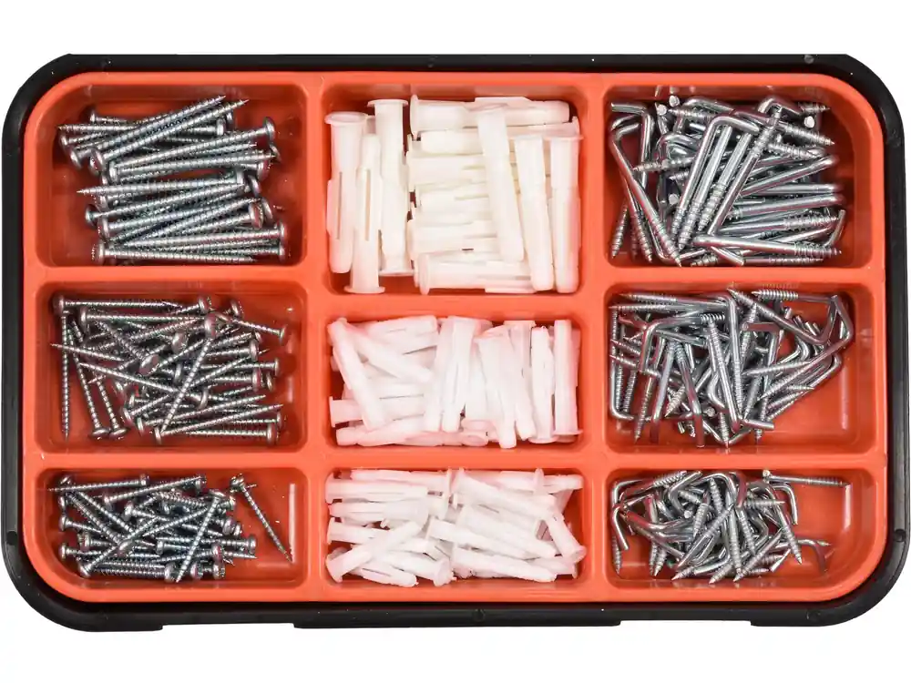 - Oszczędność czasu i wygoda dzięki kompleksowemu zestawowi najpopularniejszych wkrętów i kołków